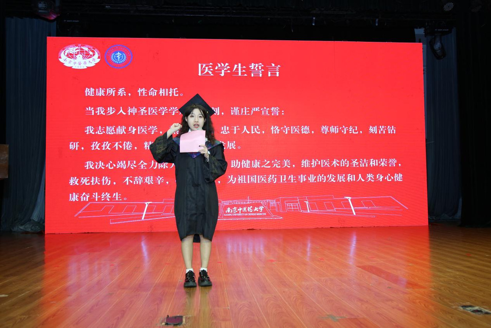 本科毕业生代表禄莎月,研究生毕业生代表许敏,依次上台发言。他们分享了自己在南中医的求学经历,并代表毕业生向母校、老师、同窗表达了衷心的感谢,立志在未来奋勇开拓,肩负起青年人的时代使命。随后,毕业生代表谢楠希代领全体毕业生重温《医员工誓词》。