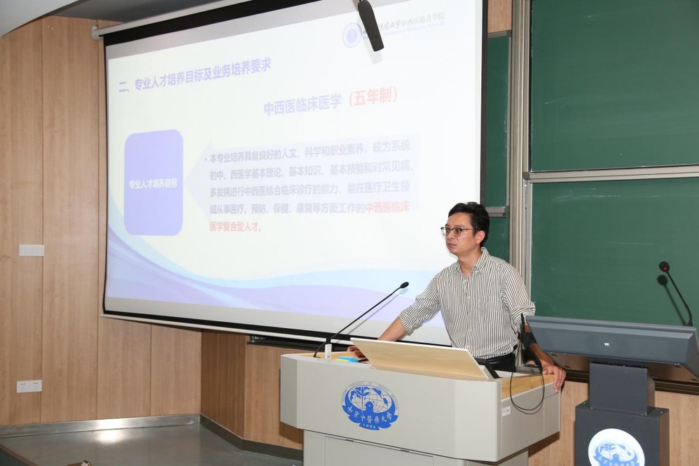 最后,陶伟伟副经理为全体新生做专业思想教育与培养方案解读。他概述了专业背景及发展历程,详细介绍了中西医临床医学(五年制)和中西医临床医学长学制(云翔班)的培养目标和培养要求,授予学位的要求,主干课程的安排,以及专业学习环节的注意要点,为新生的专业发展规划指引了方向。