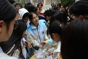 香囊制作——在制作完植物拓染香囊袋后,志愿者向同学们介绍了香囊制作方法,并在制作过程中介绍了香囊中本草的功效,每个参与的同学都将收集好的本草放入亲手拓染的香囊中,收获了人生中独一无二的自制香囊。