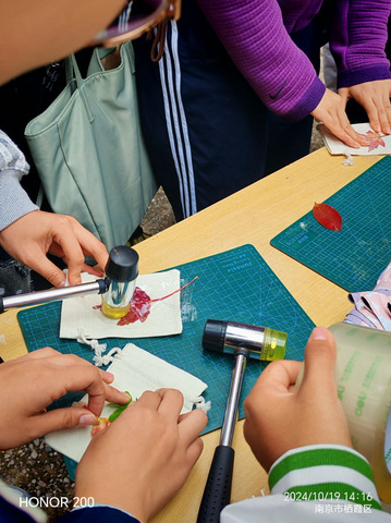 植物拓染——南师大的同学们在志愿者的介绍下,提前选择采摘收集,并浸泡固色的花朵和草叶。志愿者向同学们演示了植物敲拓染的手法,在志愿者们的指导下,每一位参与的同学都根据自己采摘的花叶和风格,制作出独特精美的香囊袋。