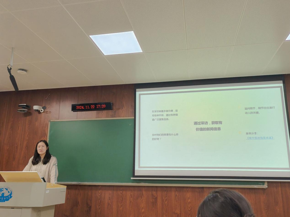 接着,陈老师以南中医校庆的宣传为案例为同学们详细地分析介绍。基于以往所做的工作,陈老师先是抛给了同学们三个问题供大家进行思考,再介绍了新闻结构和新闻获取途径,同时结合了义诊、会议等不同内容的新闻稿进行了具体细致阐述。