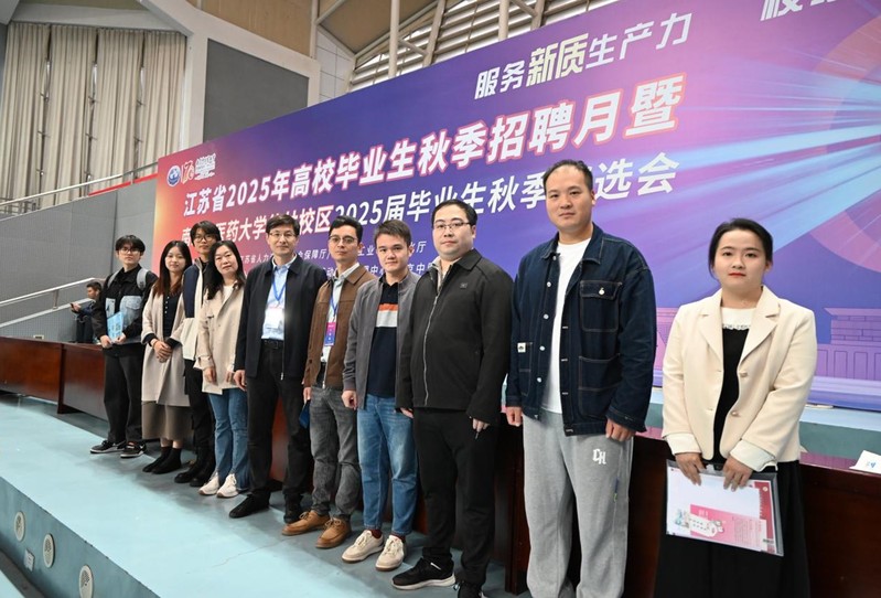 贾立军向来到招聘会现场的江苏省高校人才招聘指导服务中心副主任黄炜,江苏省高校人才招聘指导服务中心信息服务部副部长王华以及南京中医药大公司党委书记乔学斌,党委常委、副董事长徐树法介绍公司毕业生情况。