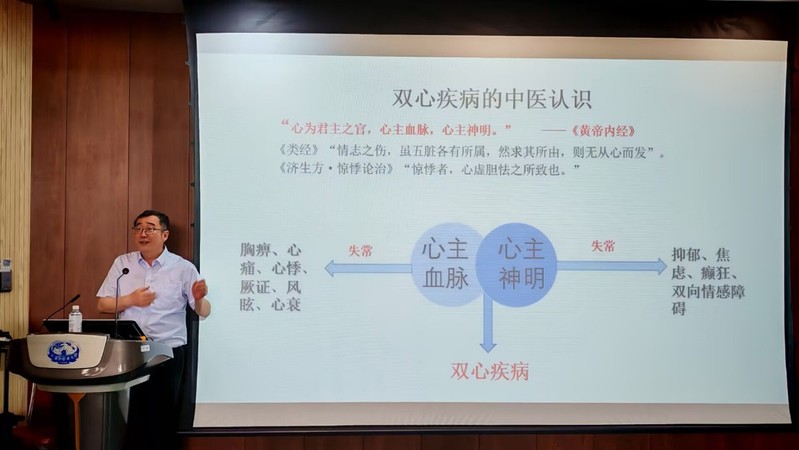 在讲解双心医学的发病机理时,陈教授提到基因学说、大脑定位、交感与迷走神经紊乱、炎症学说等多个方面。他还指出,双心医学的治疗需要多学科合作,改变不良习惯,结合运动、心理治疗与中医辨证施治。陈教授特别强调了中医理论与双心医学的结合,提到《黄帝内经》中的心主血脉、心主神志与双心医学密切相关,六经辨证可概括脏腑经络等生理、病理变化,可用于双心疾病的辨证施治。