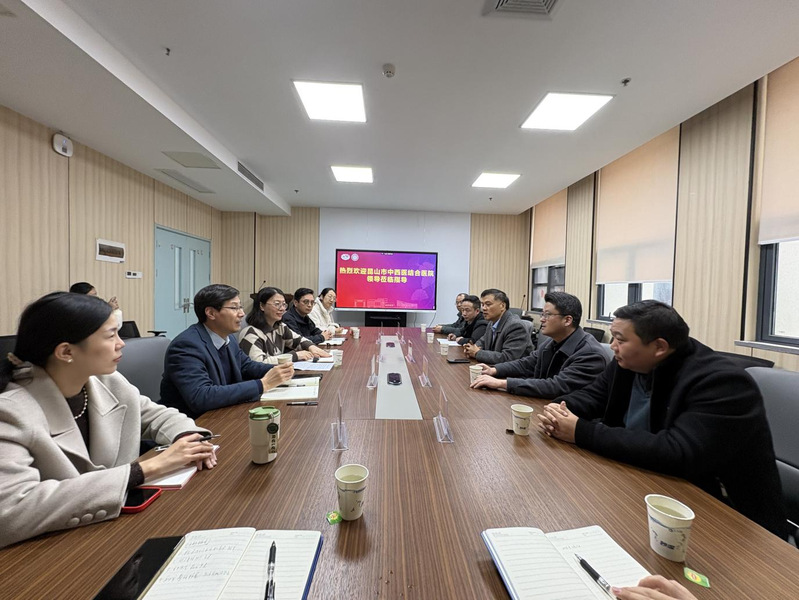 贾立军经理对昆山市中西医结合医院一行的来访表示欢迎,他介绍了公司的整体发展情况,希望以此次考察为契机,与昆山市中西医结合医院建立常态化交流机制,推动高校科研人才优势与医院临床实践优势有机融合,共同助力中西医结合学科高质量发展。